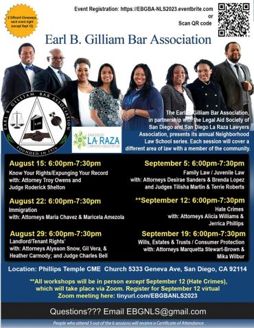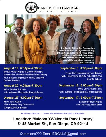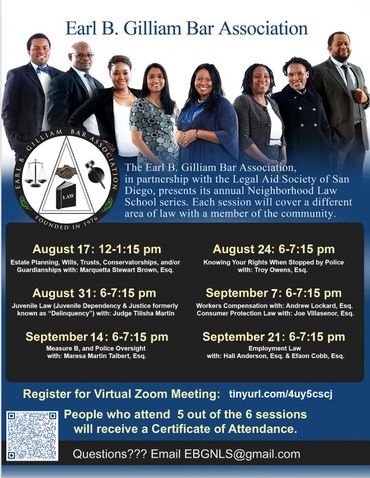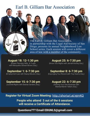 Earl B. Gilliam Bar Association, in partnership with Legal Aid Society of San Diego and our co-sponsors, presents our annual Neighborhood Law School Series. Each session will cover a different area of law with a member of the legal community.